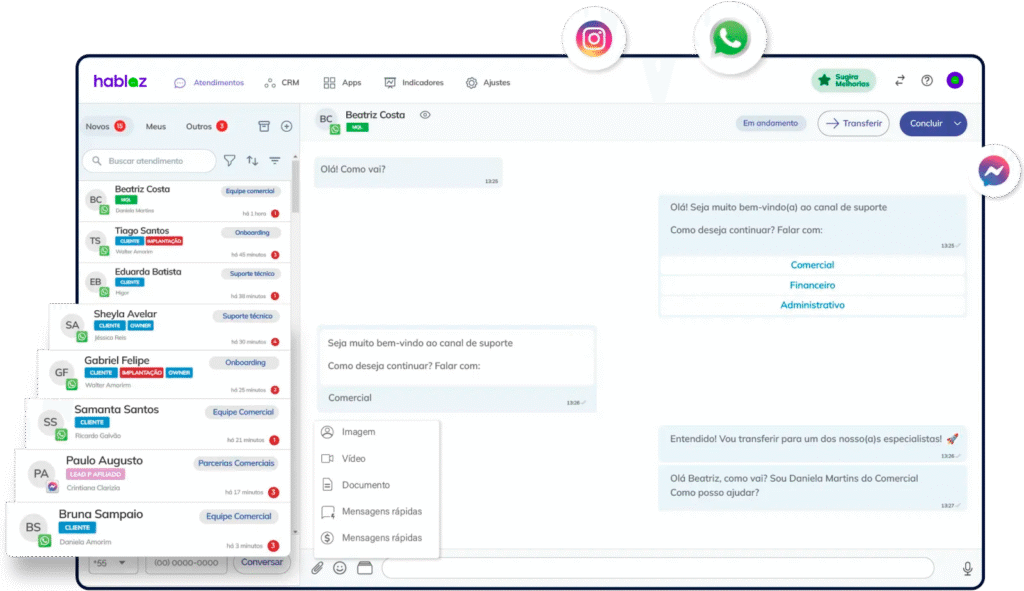 Centralize todos os contatos em um só lugar, automatize respostas, organize filas de atendimento e nunca mais perca um novo cliente por demora na resposta.